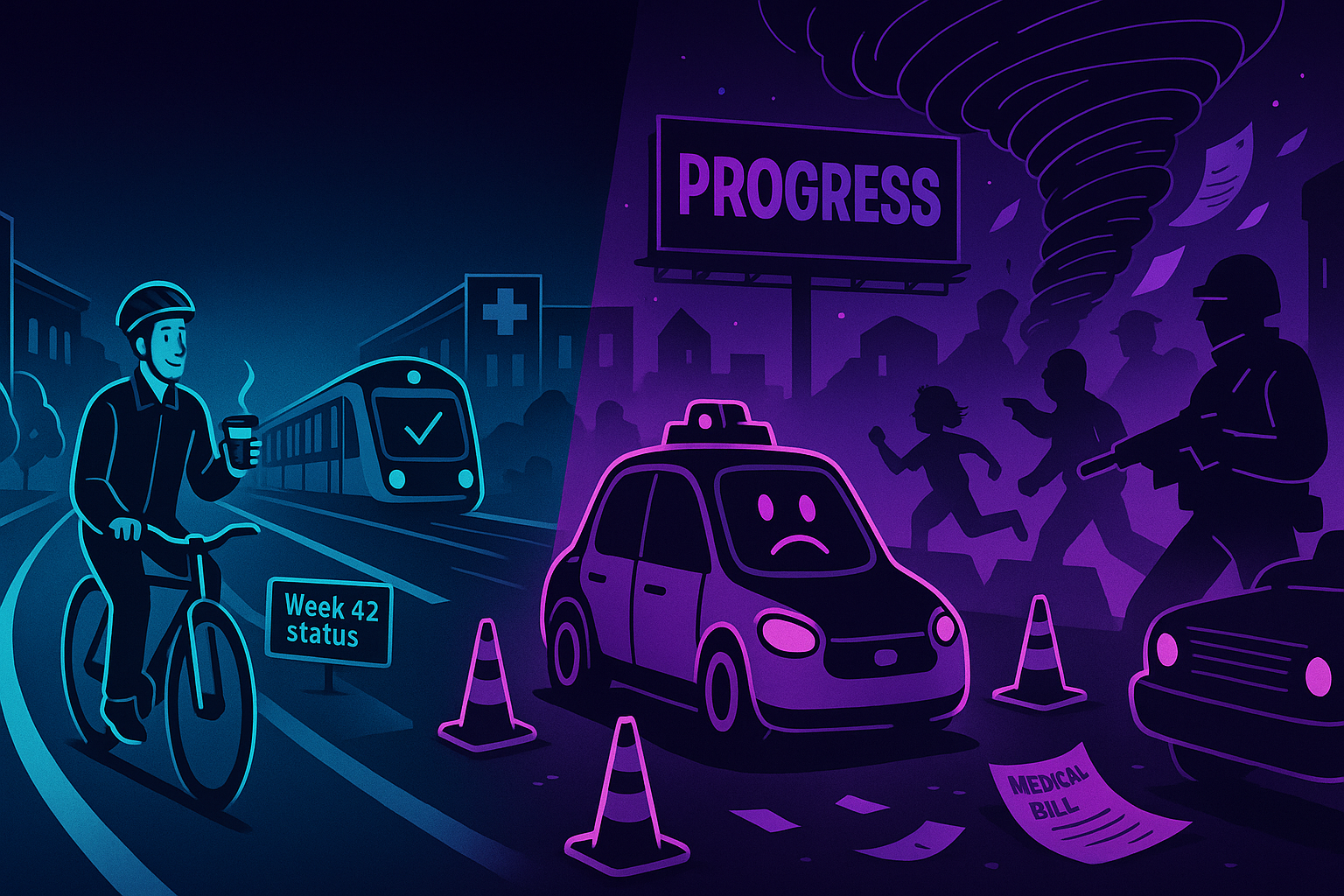 A metro hums in: on time, driverless, and far too competent to trend. Nearby, a taxi—piloted by a human—pulls away. Nobody dies. The future, deprived of a photo op, sulks quietly.